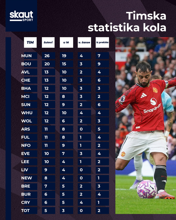 Ponovo je Portugalac počeo povučenije, a tu je ostao i nakon što je na startu utakmice Kunja izašao zbog povrede zadnje lože i ušao Zirkze koji je imao najviše šuteva od svih (7). Hrabri Barnli je dvaput stizao vođstvo – prvo je Foster pogodio na asistenciju Larsena, potom Embeumo odmah vratio prednost na asistenciju Daloa, da bi sjajni Džejdon Antoni ponovo izjednačio. Pobedu je doneo Bruno iz penala u nadoknadi za kraj sjajne lične partije u kojoj je imao 4 šuta i 6 kreiranih šansi. Sjajan je bio i Embeumo sa jednom stvorenom šansom manje i 3 šuta. Amad Dialo, koji je izborio penal, se obrukao sa promašenom ogromnom šansom i realizacija ostaje najveći problem Junajteda pošto sa stvaranjem šansi nemaju problema. Šeško se i dalje navikava na zahteve PL i ponovo je šansu dobio sa klupe.