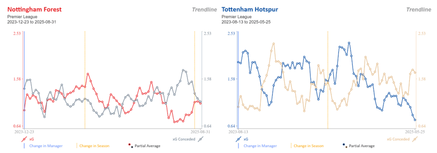 - Broj datih golova ove dve ekipe je bila jedina donekle slična stvar – Spursi su postigli 64, a Forest 58, ali su „šumari“ dosta prebacili očekivan broj golova koji je iznosio 46.67 (15. u ligi po tome), dok je xGC Totenhema bio 59.70 (9. u ligi)