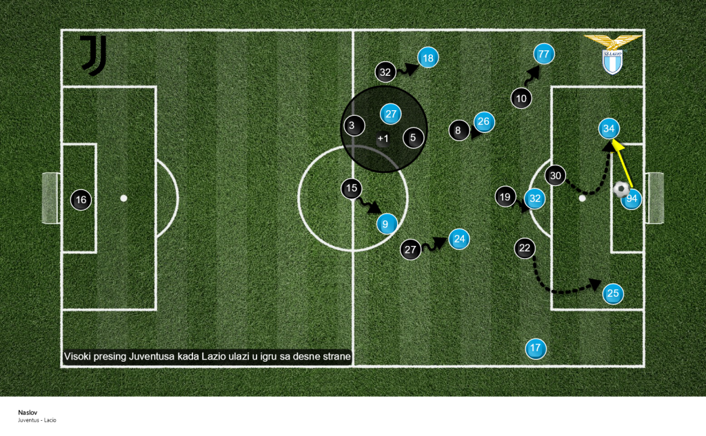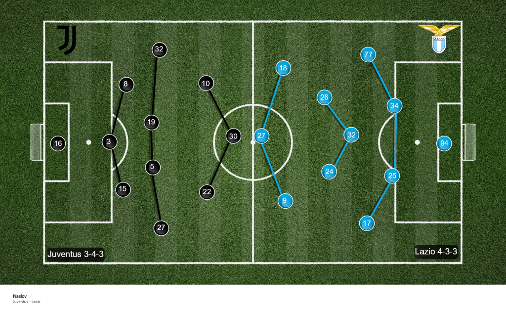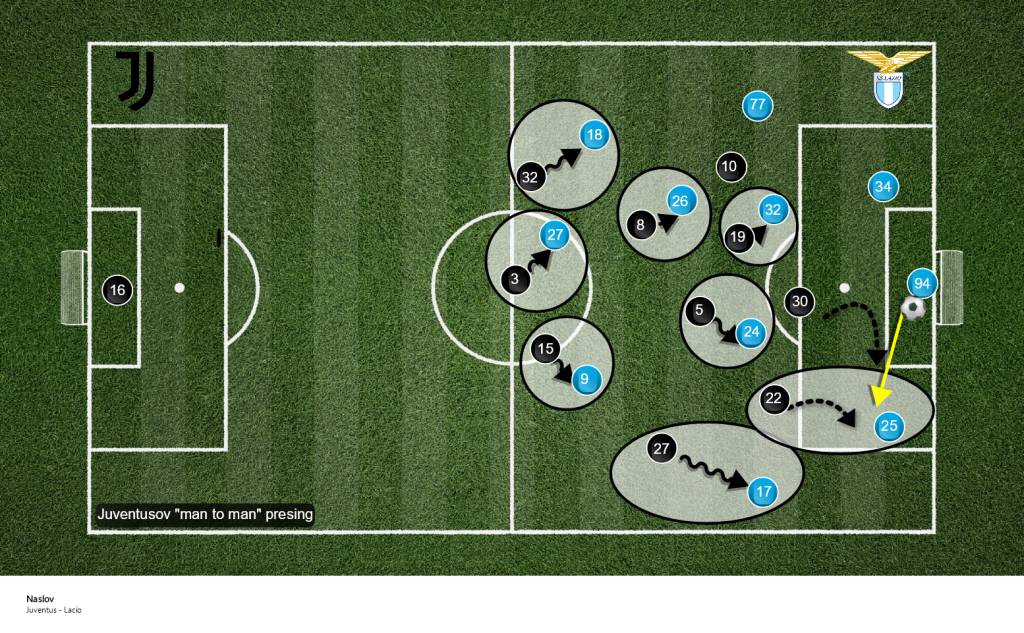 Juventus je u prvom poluvremenu izlazio man to man u zavisnosti od toga preko koje strane je Lacio ulazio u igru.